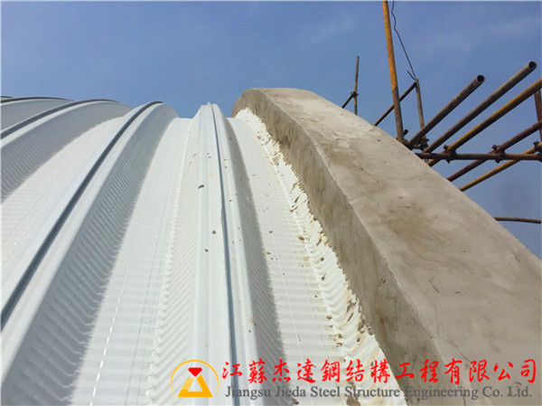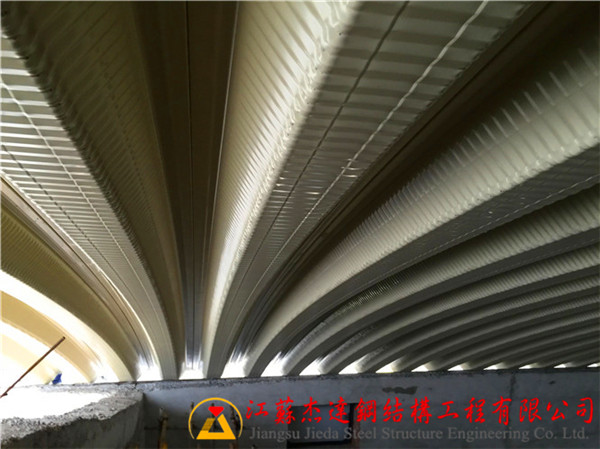 安徽安天食品糧庫拱形屋頂安裝工程采用彩涂卷材和聚氨酯保溫層,結構設計合理,施工周期合理,保障了項目順利完成。