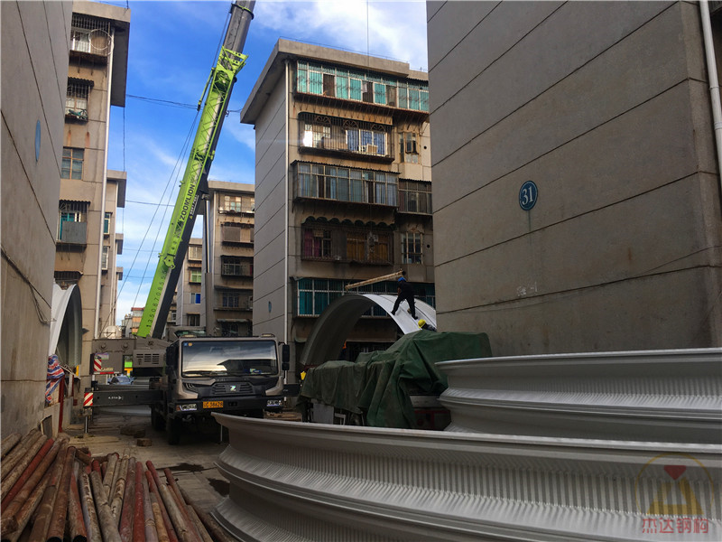 施工團隊在狹小的空間內(nèi)進行瓦片組裝和吊裝作業(yè),施工現(xiàn)場人流密集,必須合理調(diào)整作業(yè)順序以保證安全通行。由于空間限制,吊車被停放在兩棟車棚之間,極大考驗了施工人員的協(xié)調(diào)能力和操作水平。