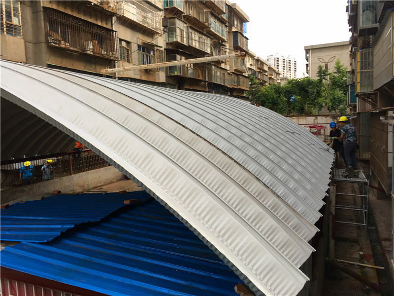 本工程位于云南省昭通市卷煙廠職工小區(qū)內(nèi),涉及兩棟拱形屋頂結(jié)構(gòu)的改造,跨度均為12米,長度分別為40米和60米。施工環(huán)境復雜,人員來往頻繁,場地狹窄,給施工帶來了較大難度。然而,憑借豐富的施工經(jīng)驗,施工團隊通過加班加點,僅用5天時間完成了車棚拱形屋頂?shù)牟饟Q工作,獲得了業(yè)主及小區(qū)居民的一致認可。