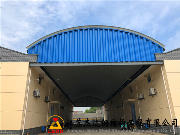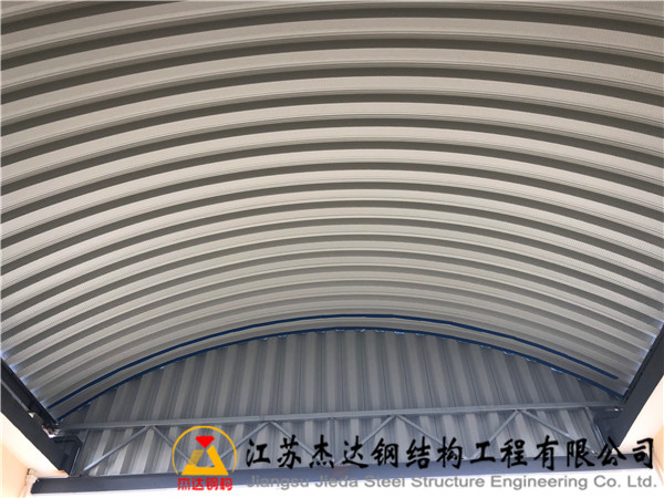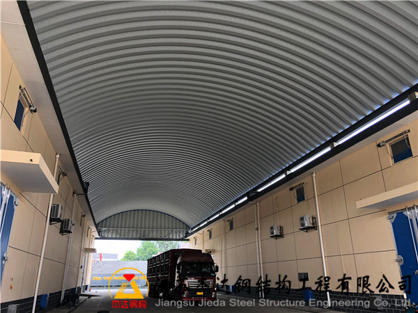 該項(xiàng)目位于江蘇省南京市浦口區(qū)糧食儲備庫內(nèi),罩棚跨度達(dá)16米,長度60米,采用拱形波紋鋼屋蓋結(jié)構(gòu)。結(jié)構(gòu)兩側(cè)設(shè)有250*250H型鋼,上方焊接托板,配合兩側(cè)桁架支撐。桁架外側(cè)覆蓋了通過壓制成型的拱形瓦片,用作山墻,增強(qiáng)整體穩(wěn)定性與美觀度。