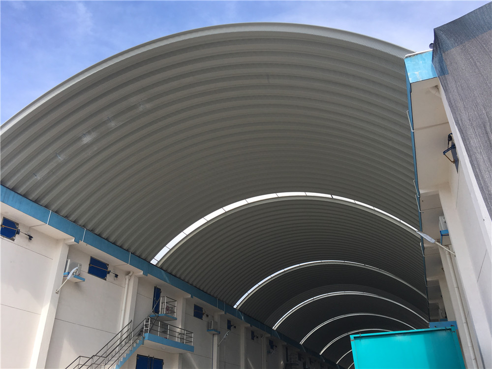 在拱形屋面瓦片之間,施工方通常會預留61公分的空位,用于鋪設采光板。中部結構采用5×5公分鍍鋅角鋼支撐,為陽光板提供牢固基礎。陽光板鋪設后,通過5.5×25mm鍍鋅鉆尾釘進行錨固,增強抗風性能。