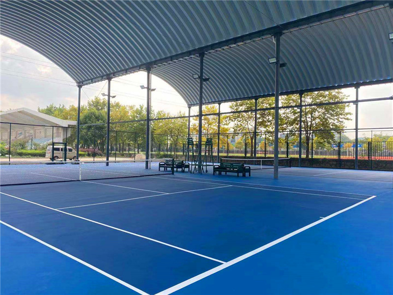 完成后的網(wǎng)球場拱形屋頂結(jié)構(gòu)與藍色地面和白色頂棚相映成趣,形成了視覺上的和諧效果,增強了場地的整體美觀。